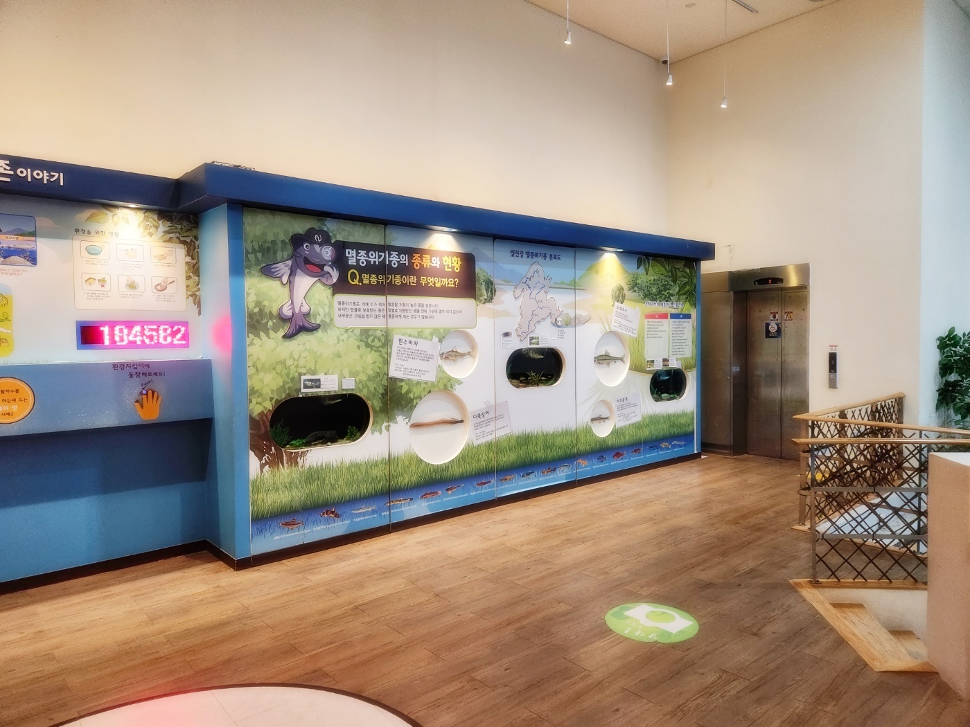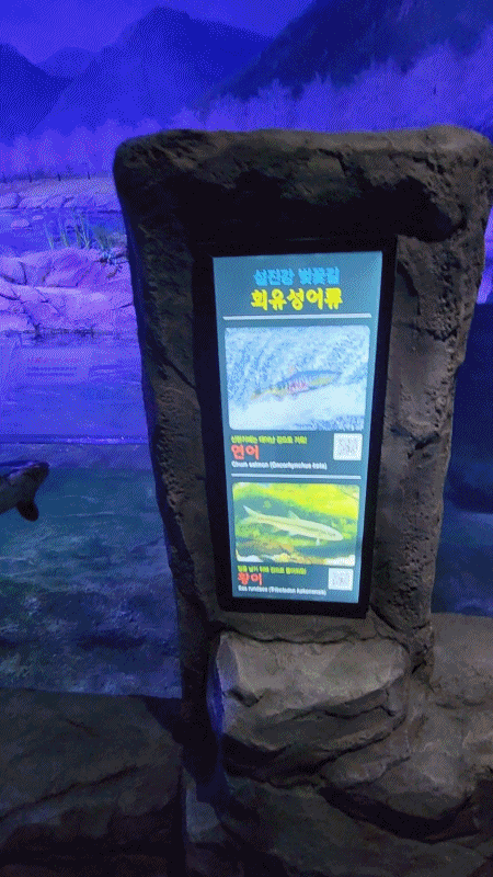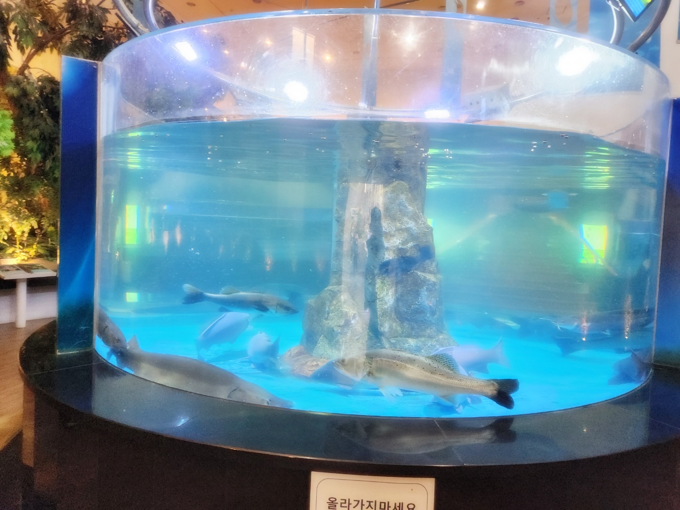 관람 순서를 따라가다 보면 이렇게 기다랗게 수조들이 놓여있고 각 수조마다 여러 물고기들이 있어 가까이서 관찰할 수 있어 아쿠아리움 부럽지 않은 사이즈에 아이들이 아주 좋아했어요. 여수 아쿠아리움이 가장 가깝긴 하고 더 크고 볼거리도 많고 하지만 그에 버금가는 사이즈이고 여러 종의 물고기들이 있어 어느 아쿠아리움 못지않았다.