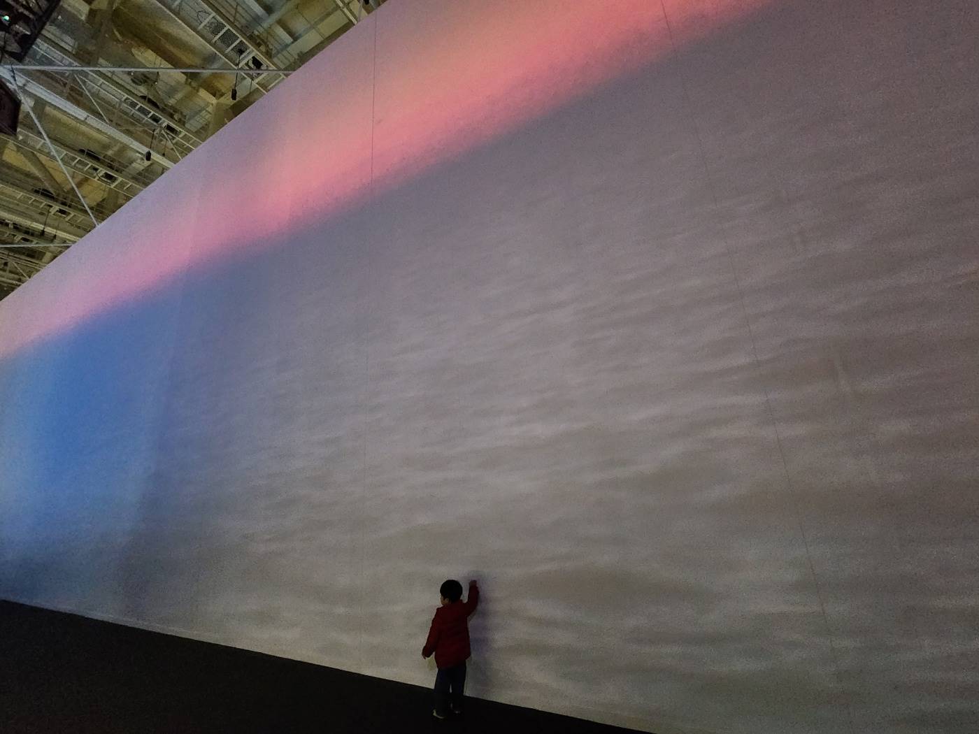 계단을 오르고 뒤에 전시장 광경을 보고있자니 너무 장관이였다. 양옆에는 파도치는 영상이 나오고있고 앞에는 화렿ㄴ 불빛들로 가득차게 되어 색다른 경험을 할수있게 된다.