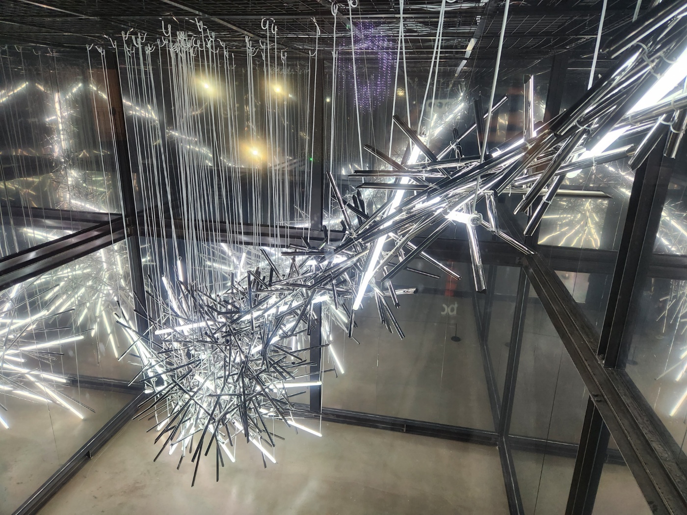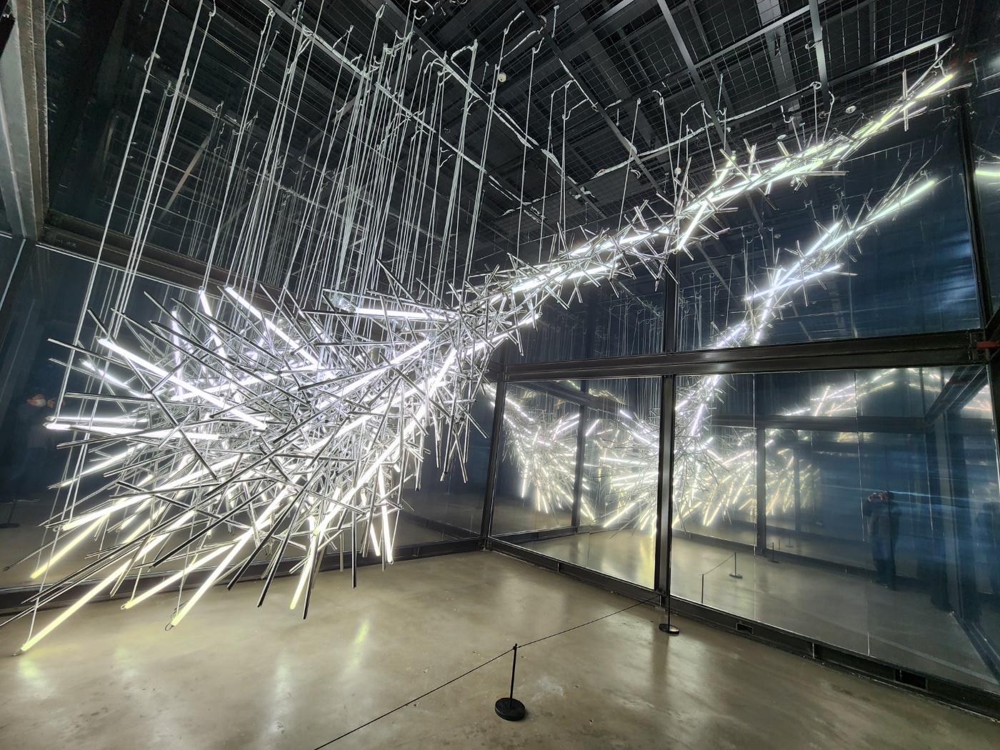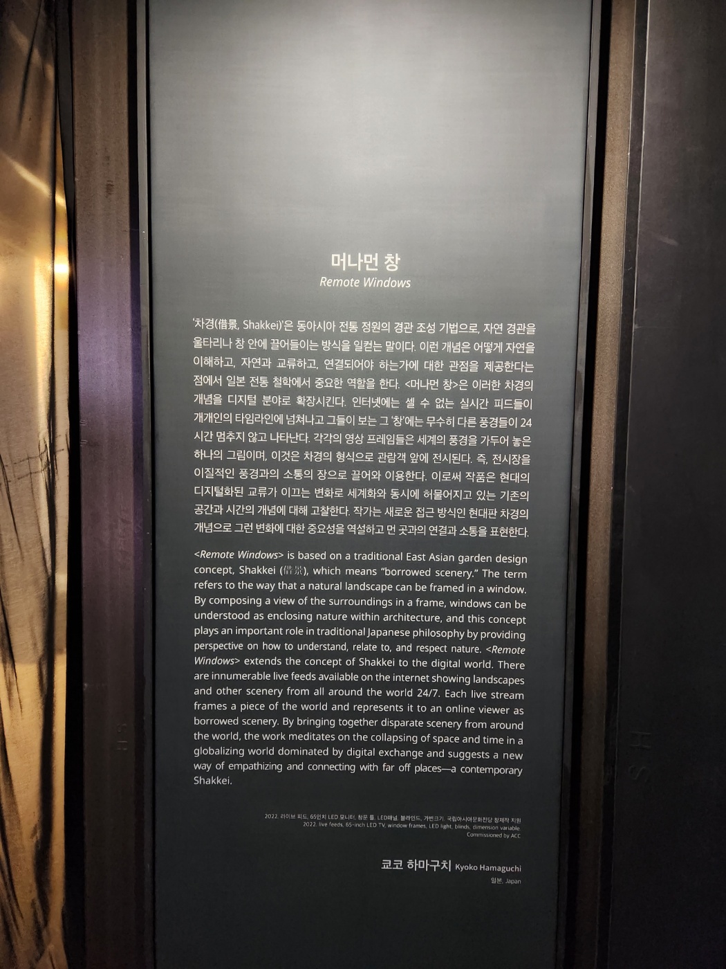 머나먼 창이라는 작품인데 차경(借景) 즉 창밖의 풍경을 미디어와 합성하여 보여주는 작품으로 창밖의 경치가 실시간으로 움직이며 동아시아 전통 정원의 경관조성 기법이라고 한다.